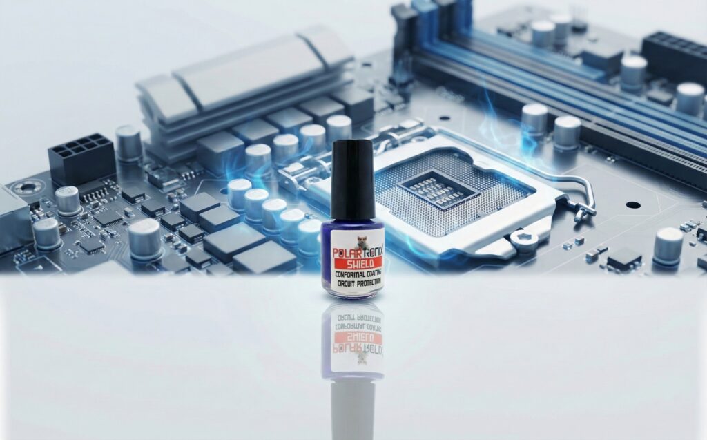 PolarTronix Liquid Metal Shield is a high-temperature conformal coating designed to help protect sensitive circuit board components when applying liquid metal. The blue 5ml coating creates a protective barrier around nearby areas to help reduce the risk of short circuits and improve application safety.